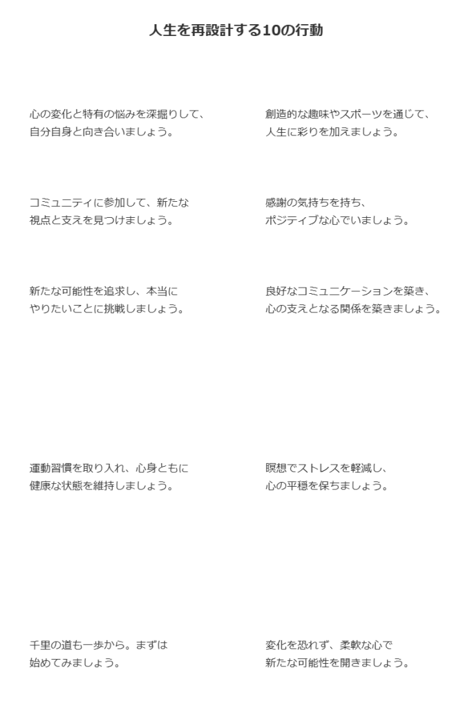 行動することの重要性を理解し、小さな一歩を踏み出すことで、人生を再設計しましょう。